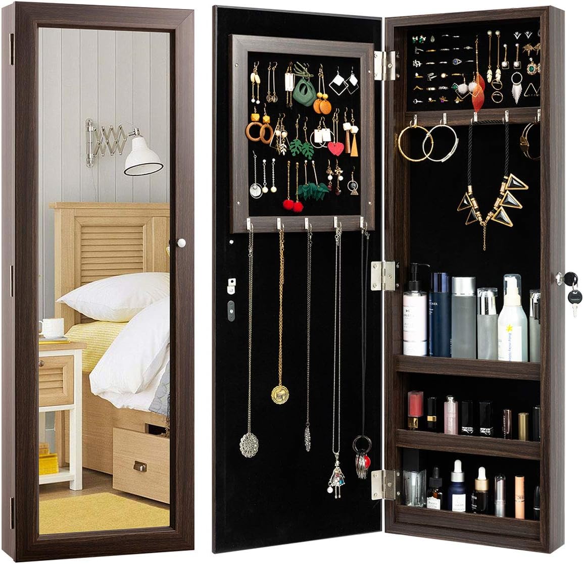 صندوق مجوهرات معكوسة من هوليود هوم منظم مجوهرات قابل للإغلاق وحامل للمجوهرات مع مرآة بطول كامل وموفر للمساحة بني Amazon Ae